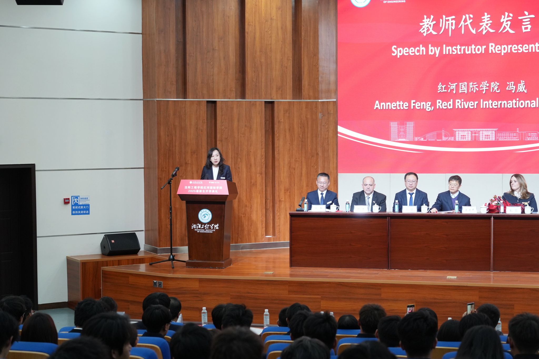 教师代表、太阳成集团tyc234cc语言培训中心主任冯威老师上台发言。她结合自身教学经历,分享了国际学院的教学理念与培养目标,用温暖的话语叮嘱新生要尽快适应大学生活,珍惜双语教学资源,主动与老师、同学交流,在探索中收获知识、提升能力,同时承诺全体教师将秉持初心,用心浇灌每一位学生的成长。