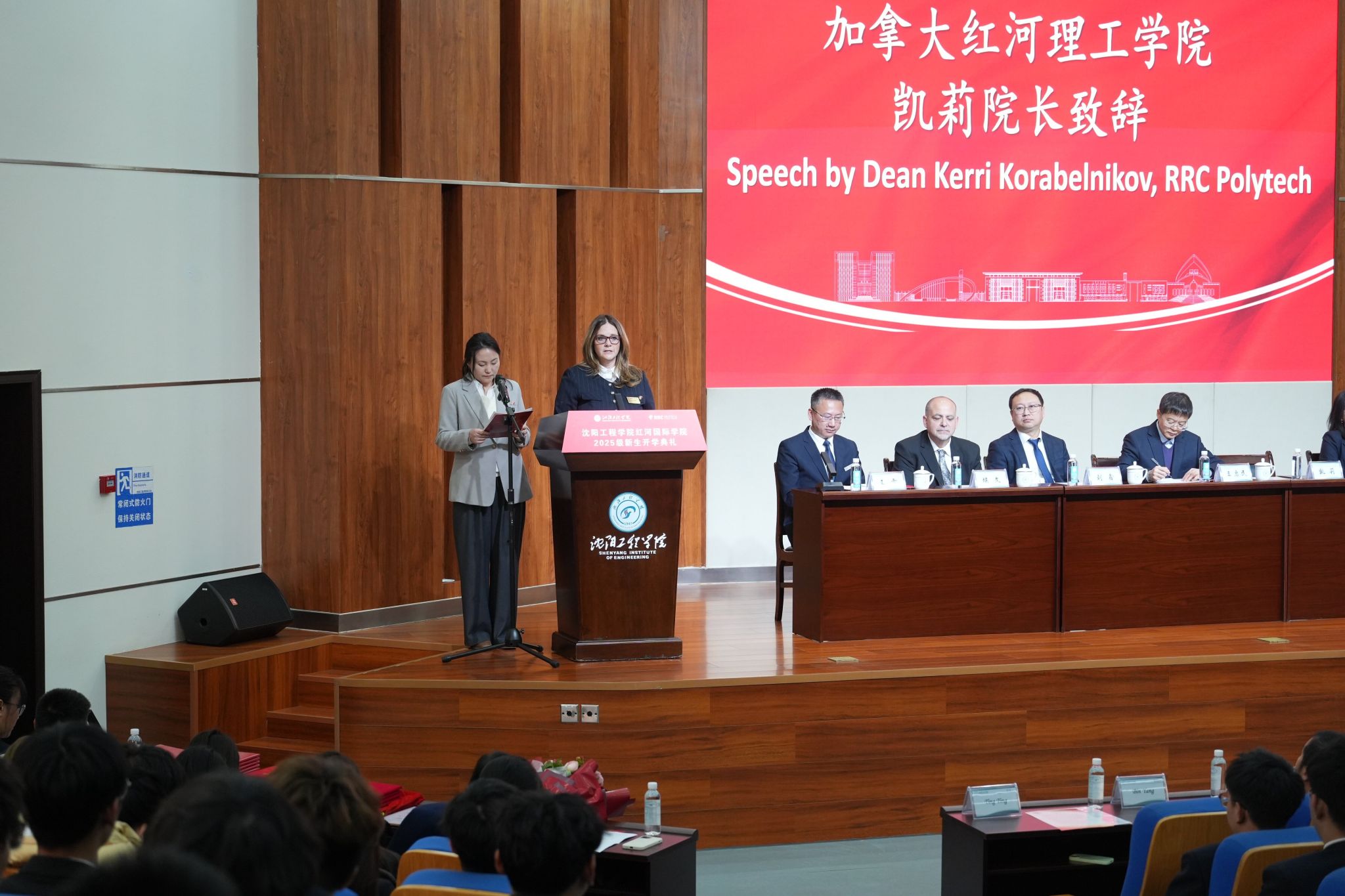 加拿大红河理工学院教育、艺术与科学学院院长凯莉紧随其后致辞。她高度肯定两校合作成果,对新生加入太阳成集团tyc234cc大家庭表示祝贺,并用生动的语言介绍了加拿大红河理工学院的教育特色与资源优势,鼓励新生充分利用两校合作平台,积极探索、勇于突破,在国际化学习环境中实现自我成长,为中加文化交流贡献青春力量。