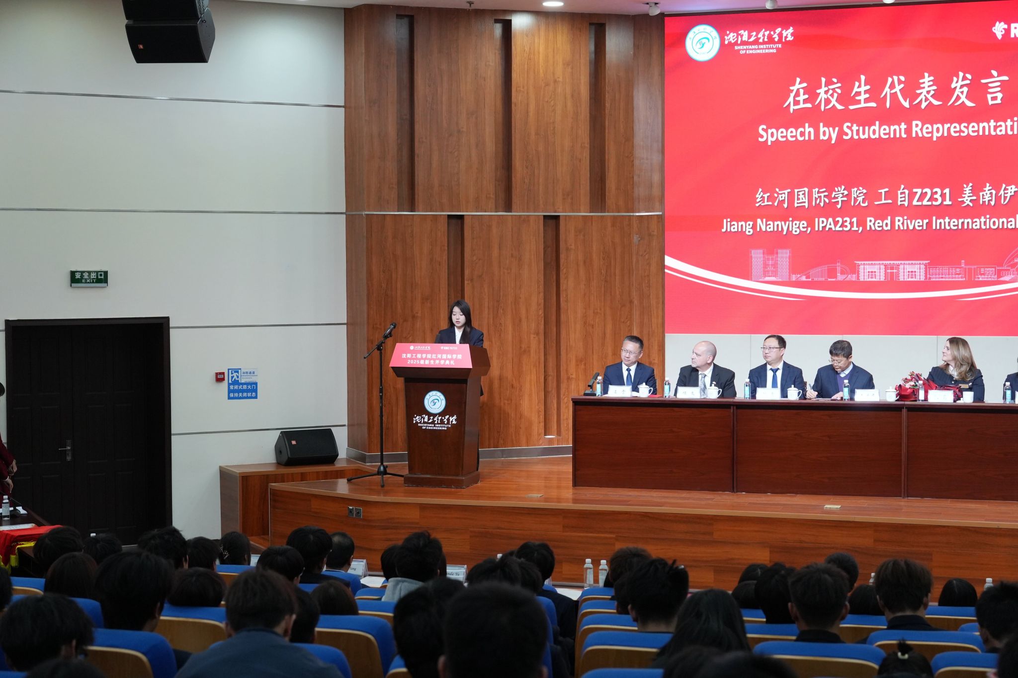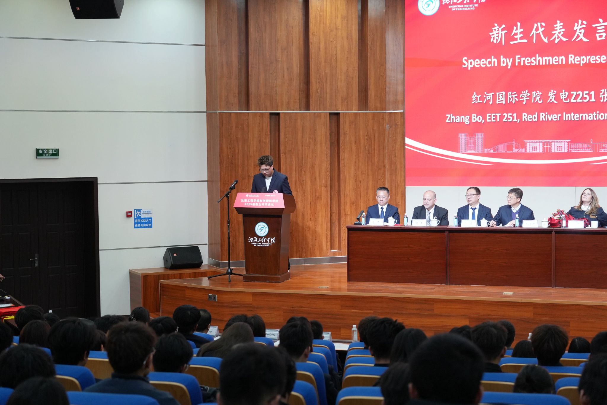 新生代表、2025 级发电厂及电力系统专业张博同学发言。他代表全体新生感谢两校搭建的国际化教育平台,他表示,全体新生将充分利用两校优质资源探索知识,深入理解中加文化与思维模式,在集体中相互鼓励、并肩前行,用热情与汗水浇灌梦想,用奋斗与实干书写属于 2025 级的青春篇章。